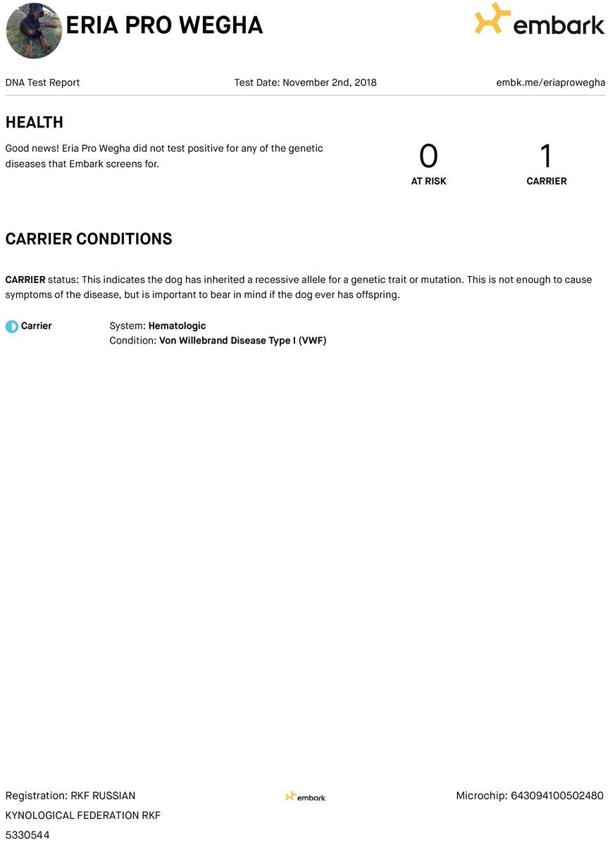 Wegha fez exames de DNA através do Dobermann Diversity Project, cujos resultados estão relacionados abaixo: